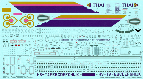 signing the decal, with lots of small detail decals included. The Italian printer (probably Cartograf) did an excellent job of printing it. A few niggling detail errors though. Glaring is the omission of the large gold logo that (for about the last 6 years) almost completely covers the forward cabin door on both sides of the aircraft. Secondly, the registrations for the PW powered A.330’s are in the HS-TE series. The decal requires the modeler to piece it together HS-T, E and the last letter. Third, the aircraft names *: 10 ship names are provided in English (for the Port side), 9 in Thai (for the Starboard side). Some of the aircraft names are mis-spelled – “Sri Sakhon” (TEB) should be “Si Sakhon”, “Bang Rajan” (TEC) should be “Bang Rachan”, “Srichulalak” (TEK) should be “Srichulak”, and the name for TEK in Thai is missing. While HS-TEL and ‘TEM are PW4000 powered, they cannot be modelled as neither the “L” nor “M” are provided, nor the ship names.