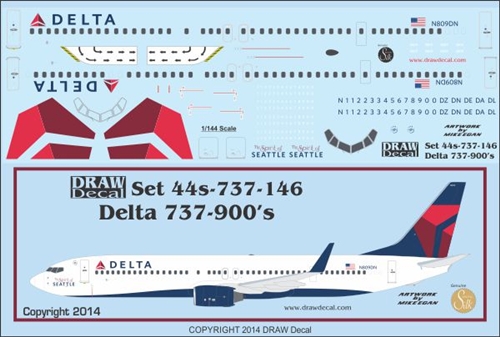 Finally, sets have been released for the Delta Airlines Boeing 737-900, available in 1/144 scale (DW44-737-146) and in 1/200 scale (DW20-737-146).