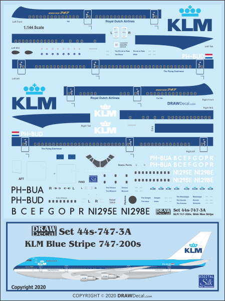 DRAW Decal has heavily updated and re-released their KLM Boeing 747-200, 200SUD and 300 decals. Where once there was one, there are now three, so that the details needed for each can be better presented.