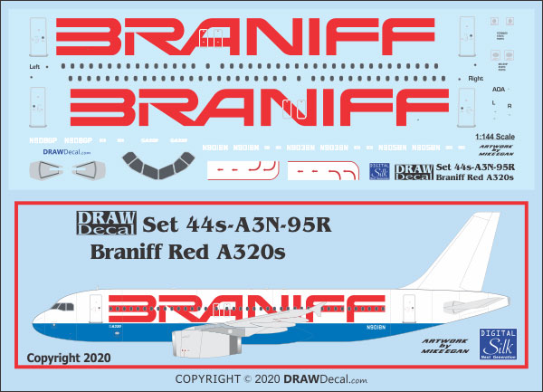 DRAW Decal has released decals for the Braniff Airbus A.320 fleet. The A.320 fleet was delivered to the second “Braniff”, and 10 were painted, 5 were delivered, and 2 went into service before this iteration also declared bankruptcy.