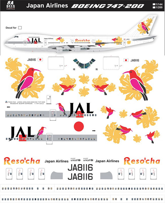 - 8A144-704Y 8A200-704Y Japan Airlines ‘Reso’cha’ Boeing 747-200B (yellow titles)