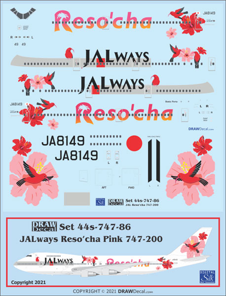 DRAW Decal began the week with the release of a Japan Airlines Reso’cha Boeing 747 decal.