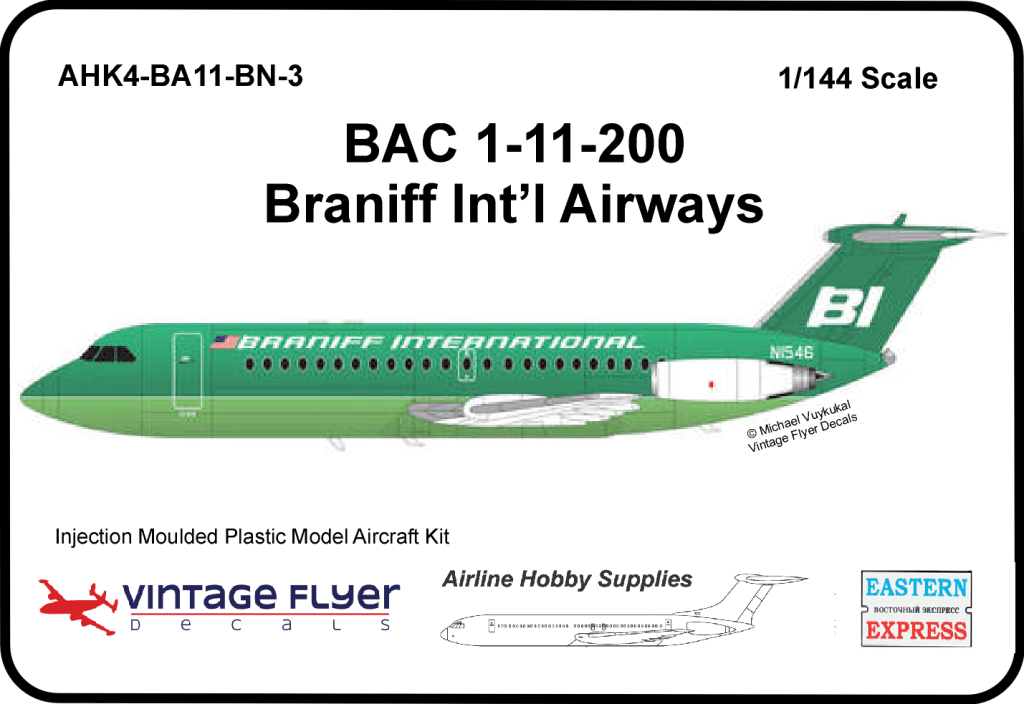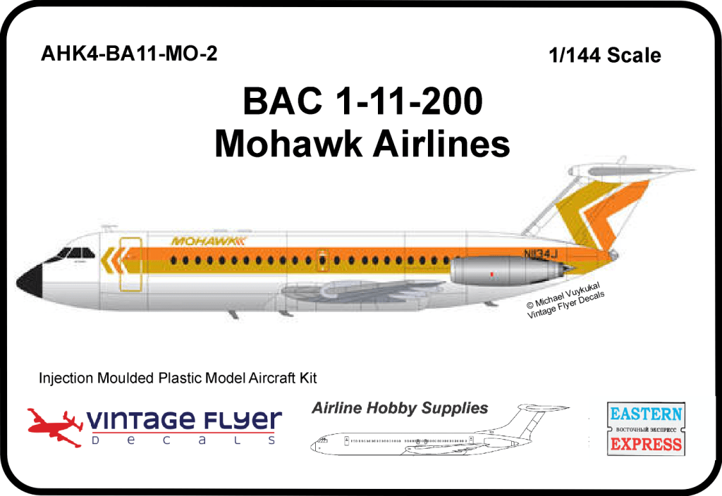 We are packaging the 1/144 scale Eastern Express BAC 1-11-200 / -300 / -400 with a decal by Vintage Flyer. All of the recently released VFD 1-11 decals are available as options, along with an option with a “Detail Decal” that will enhance your alternate airline decal.