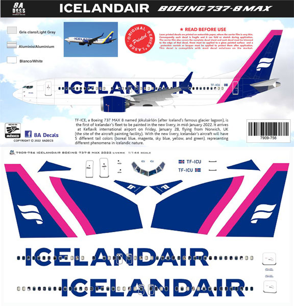 8ADecs previously announced the Icelandair 737-MAX8 fleet, with the release of the blue stripe scheme. The other three stripe colours Magenta and Yellow are also now available, Green is coming soon.