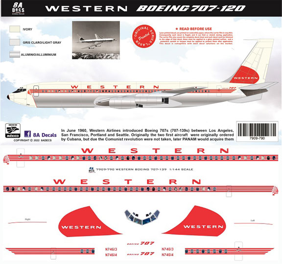 - 8A139-790 8A144-790 Western Airlines Boeing 707-147. The 1/139 scale decal is intended for the Atlantis / Revell kit), the 1/144 scale decal for the Authentic Airliners kit.