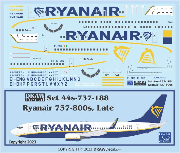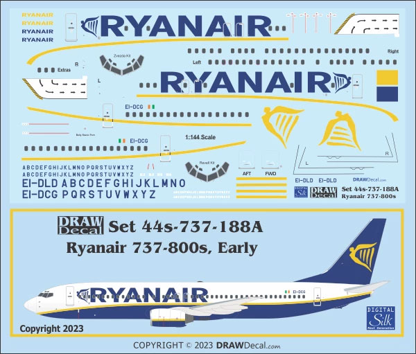 DRAW Decal has released two sheets for the Ryanair Boeing 737-800, with earlier and later titles styles.