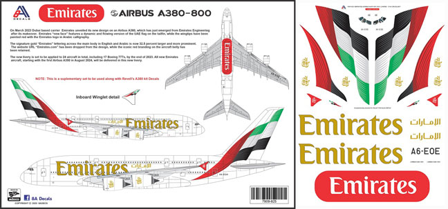 First out of the gate this week is a release from 8ADecs. They’ve added a decal for the new Emirates A.380 scheme to complement their recent release for the Boeing 777-300ER.