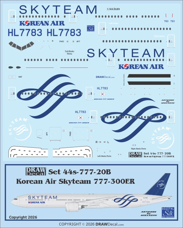DRAW Decal has added to their range of Korean Air decals with the addition of one for the Boeing 777-300ER in ‘Skyteam’ markings.