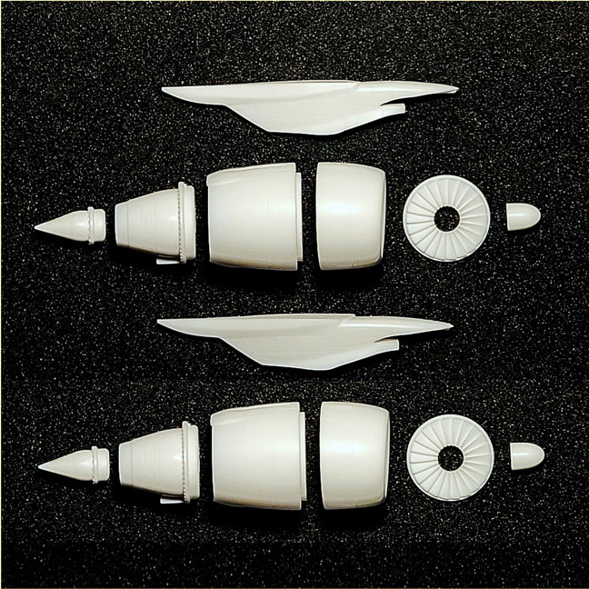 Here are the #1 and #3 engines and and “S” duct for the #2 engine. Also on this sprue are parts for the rear airstairs and nose gear well.