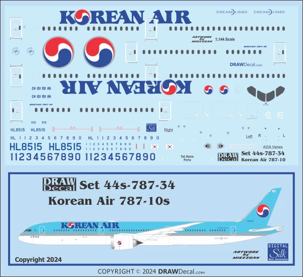 DRAW Decal has released a new set for the Korean Air Boeing 787-10, joining the set released previously for the 787-9.
