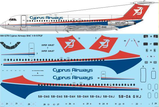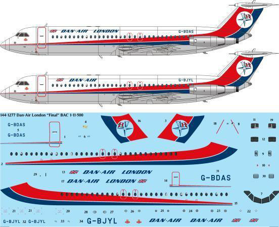 26 Decal has released three more sets for the recently released Mark 1 BAC 1-11-500 kit, providing for three versions of the Dan Air London livery. The differences appear to be in the size and colour of the airline titles.
